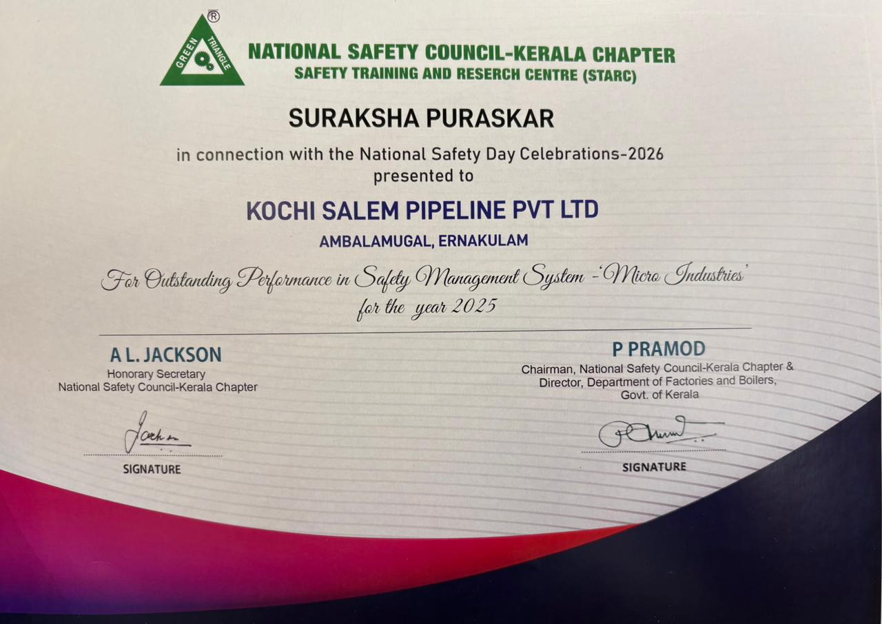 Kochi Salem Pipeline Private Limited (KSPPL-JV of IOCL & BPCL) has won Suraksha Puraskar from National Security Council-Kerala Chapter